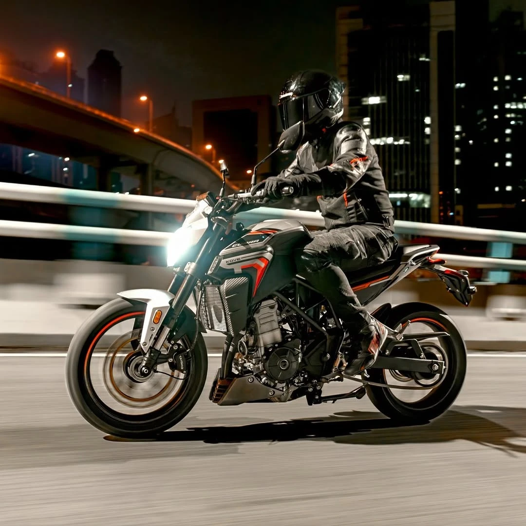 El reel compartido por Kove Moto Argentina muestra una moto con un carenado agresivo, faros afilados en doble óptica LED, una línea muy estilizada hacia la cola y una postura deportiva que recuerda a varias naked y deportivas europeas.