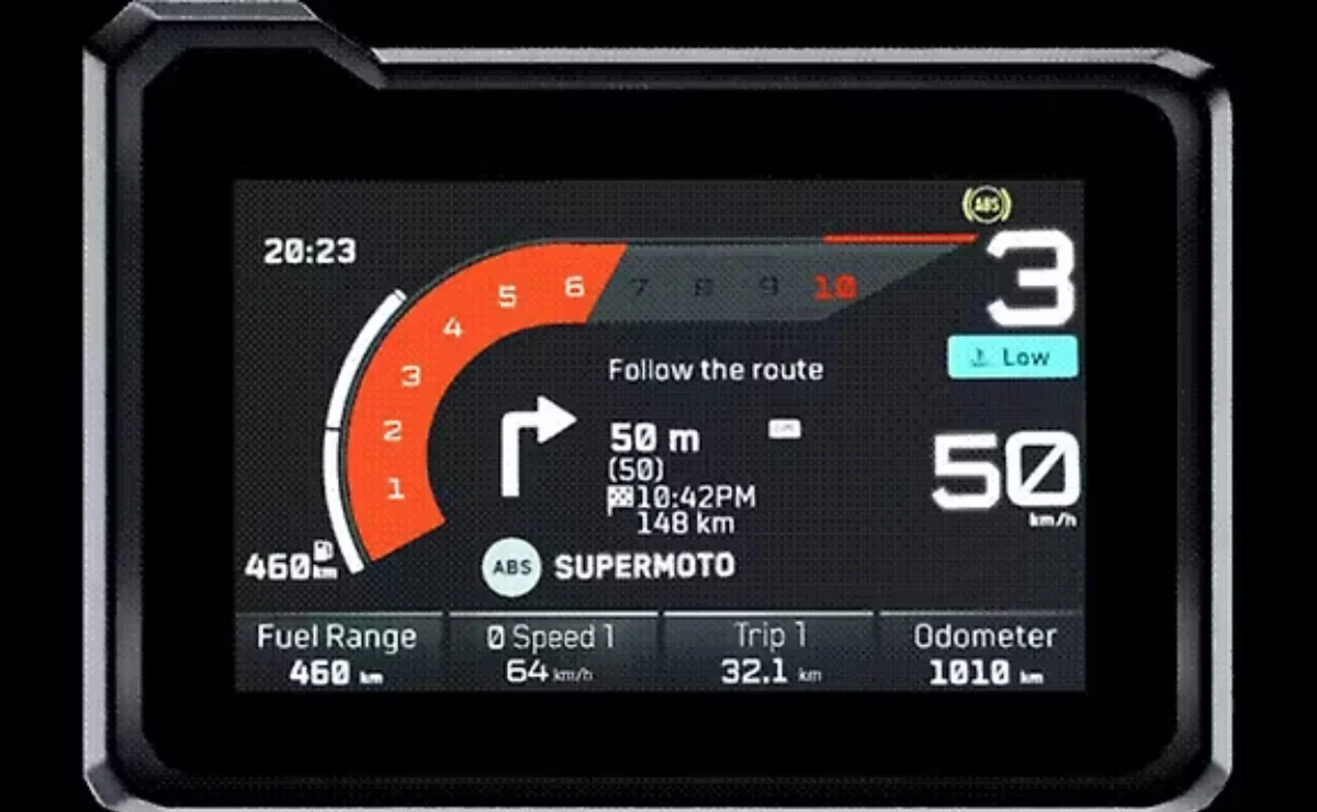 Esta función permite a los pilotos desactivar el ABS en la rueda trasera bajo demanda, permitiendo derrapes controlados y una conducción mucho más agresiva en situaciones específicas. Además, la interfaz es camaleónica: permite configurar las RPM de cambio y la zona roja, cambiando la visualización entre un modo oscuro y el icónico naranja de la marca según el régimen del motor.