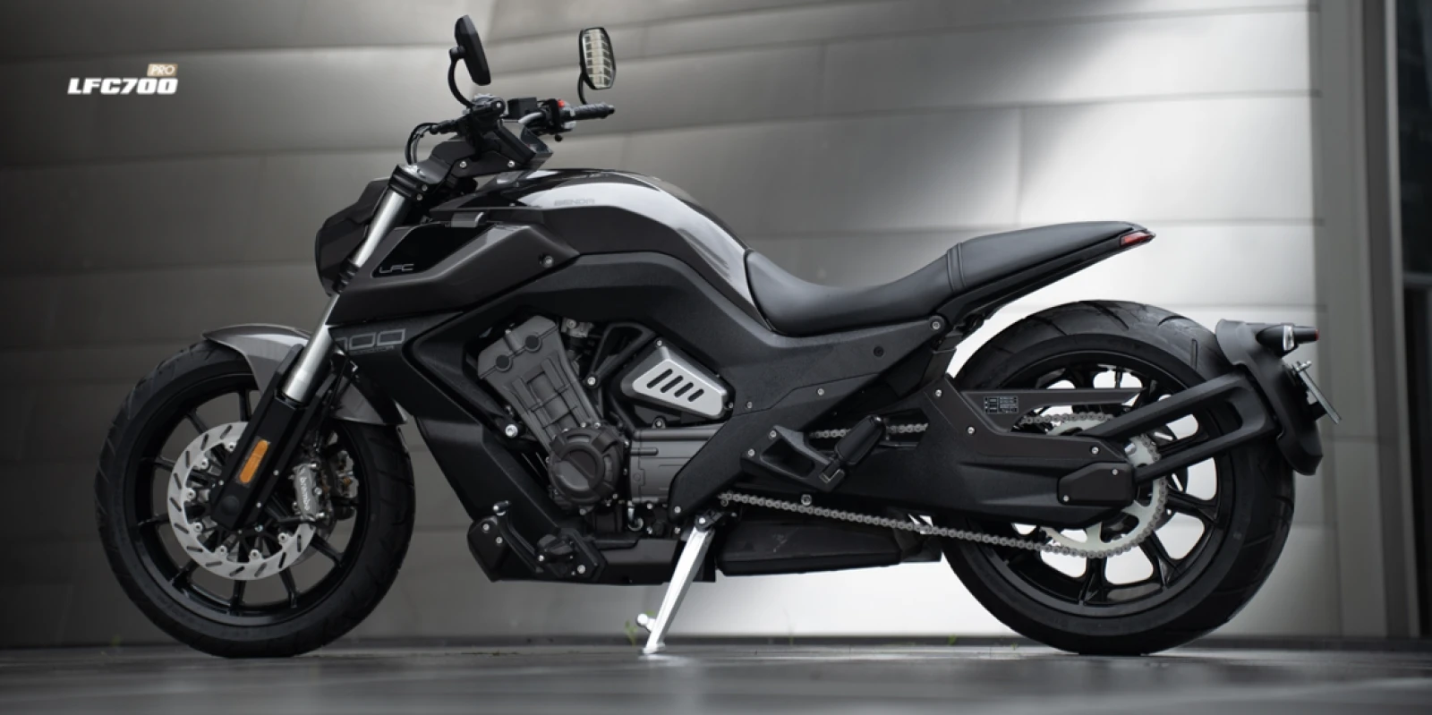 Uno de los aspectos más sorprendentes es su motor. La LFC 700 Pro equipa un cuatro cilindros en línea de 676 cc, refrigerado por líquido, una configuración poco habitual en el segmento custom de media cilindrada.