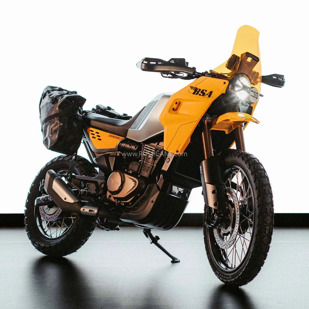 La BSA Thunderbolt ADV combina la estética clásica de la marca con un diseño adaptado al terreno. Destacan sus dobles faros asimétricos LED, un pico frontal tipo “beak”, pantalla ajustable en altura, defensas laterales robustas y un llamativo color amarillo que evoca el espíritu vintage de BSA.