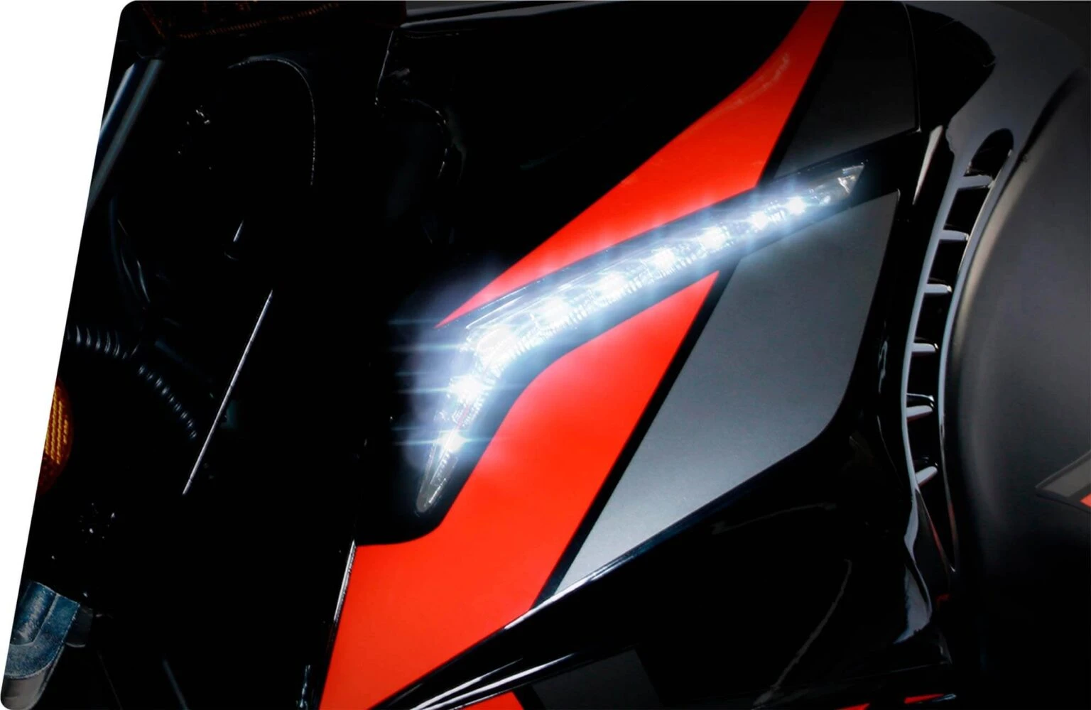 - Iluminación y visibilidad: equipa LED laterales que mejoran la presencia de la moto en el tráfico nocturno, un tablero análogo-digital de alta visibilidad y un parabrisas frontal que mejora la aerodinámica y protege al piloto.