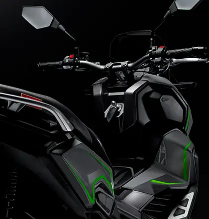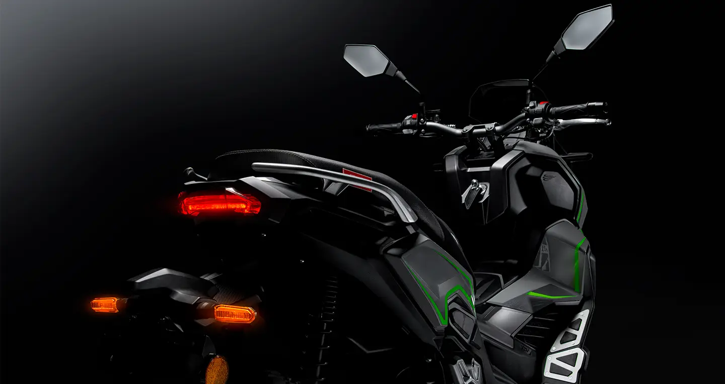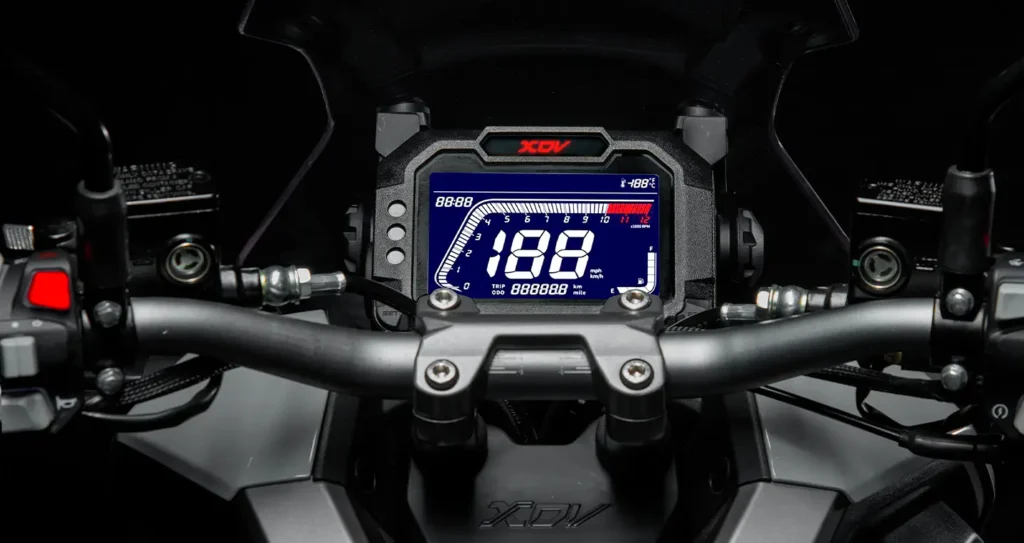 - Este modelo sigue la línea estética de las motos «Adventure», con líneas angulares y una presencia imponente.