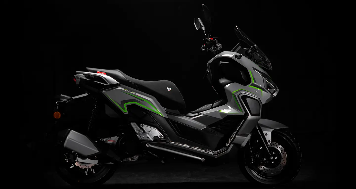 La XDV 175 GT es una scooter de aventura con motor de 175 cc, 11 Hp y 12 Nm, que utiliza refrigeración por turbina. Aunque no está en Colombia, su precio internacional de $2,650 USD la posicionaría cerca de los $12.000.000 COP, compitiendo por tecnología y diseño frente a las 160 del mercado.