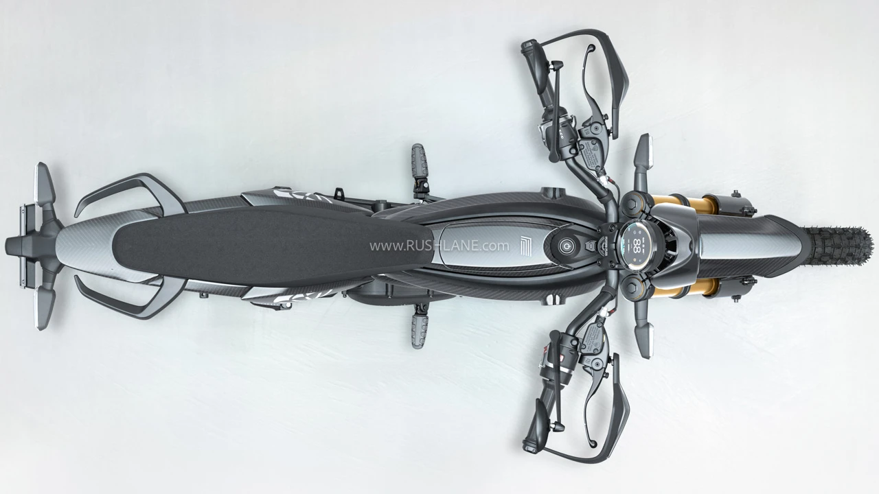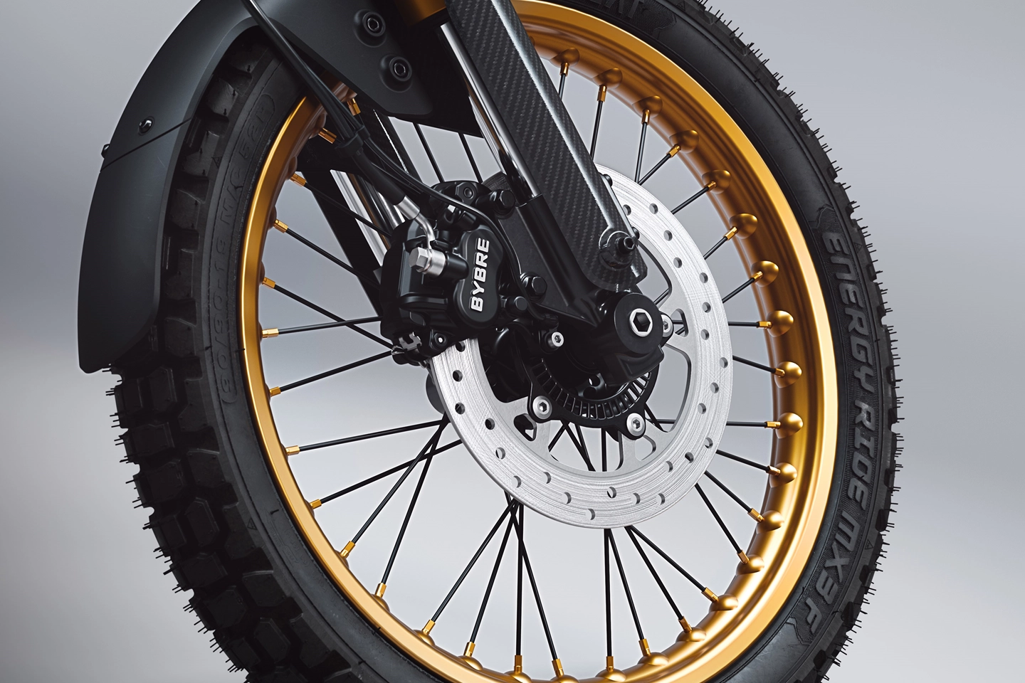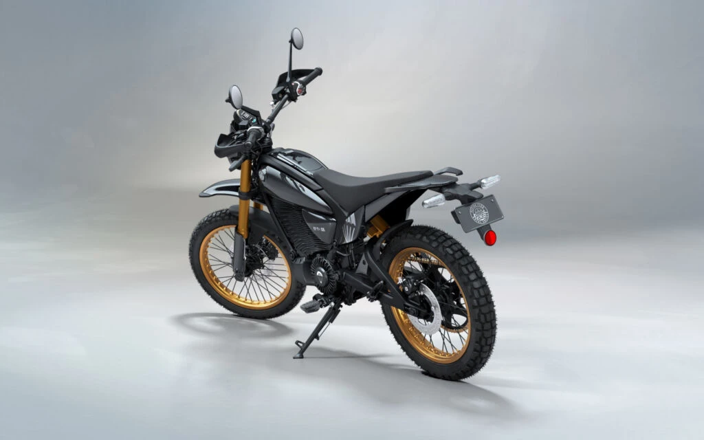 Su carrocería combina aluminio, magnesio y acero, ofreciendo un equilibrio entre ligereza y resistencia. El conjunto destaca por su asiento plano tipo enduro, guardabarros elevados, y rines escalonados de 19 pulgadas adelante y 18 atrás, ideales para superficies mixtas.