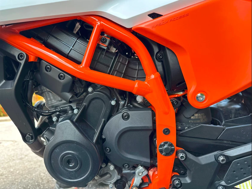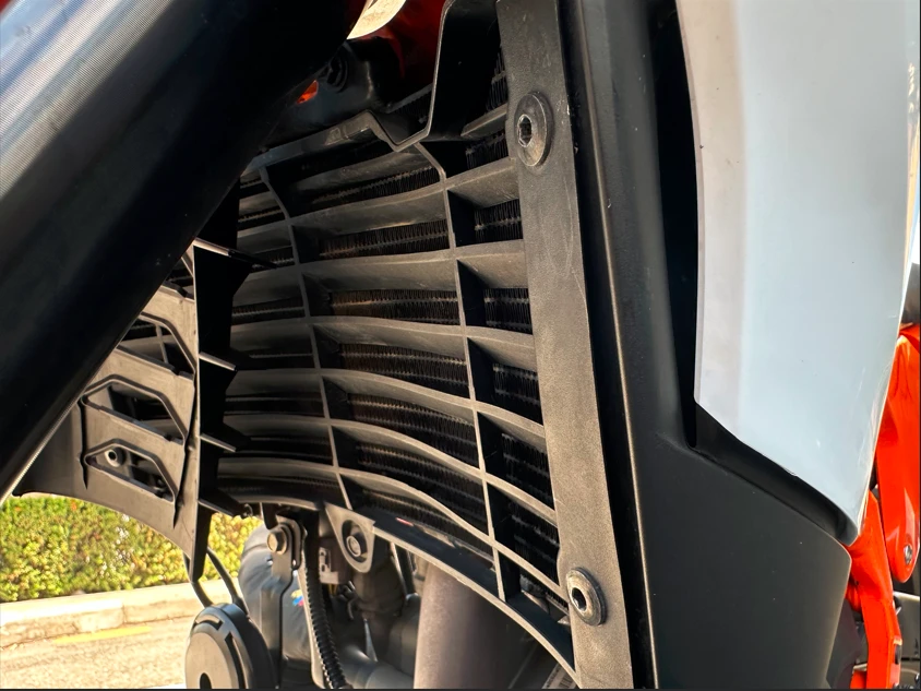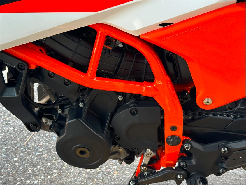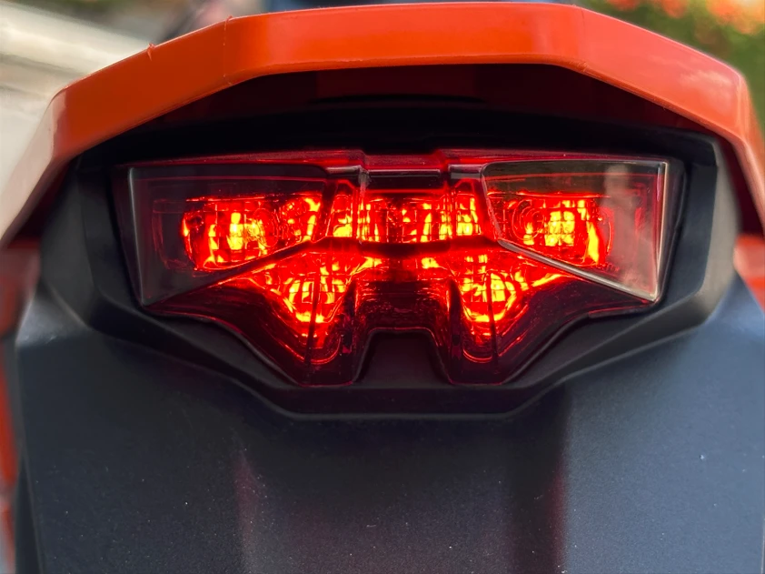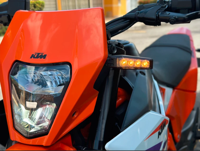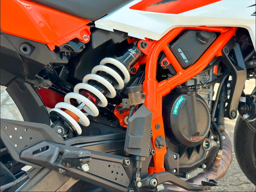 Otro aspecto que hereda de su hermana mayor, es su sistema de escape, va abajo, la postura y salida es lo mismo, si la comparamos con otras marcas, estas van arriba. Se ve moderno, ligero, listo para reventar cada acelerada con ese sonido característico de KTM. Súmale las formas trianguladas del tanque, los plásticos ajustados al milímetro, el subchasis expuesto justo lo necesario y ese look “street–racing” con alma de pista.
