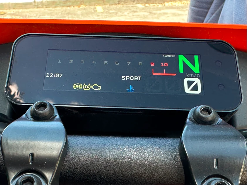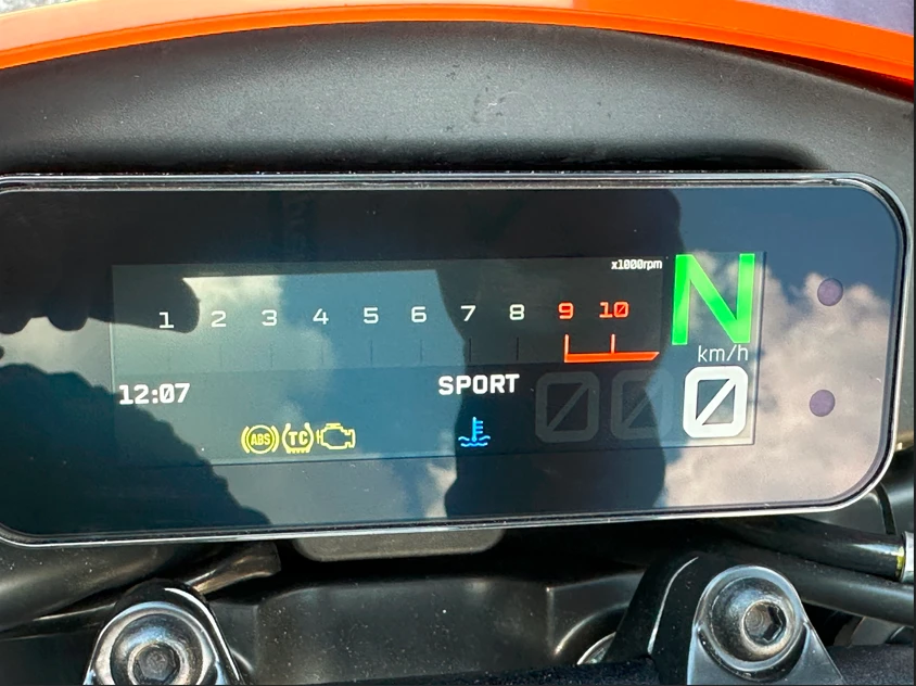 Viene con un tablero TFT a color de última generación de 4,2”, esta tiene un recubrimiento que evita el rayo del sol de forma directa, súper nítido. Te muestra velocidad, tacómetro digital en barra, marcha engranada, carece de nivel de combustible y es una pena ya que la moto cuenta con un depósito de 9 litros (2,3 galones) y este fuese útil, bien sea para un viaje largo o en ciudad tener ese auxilio, temperatura del motor, autonomía, consumo promedio e instantáneo, pero ojo, no son precisos, es un aproximado, odómetros parciales y hasta las configuraciones de los modos de manejo.