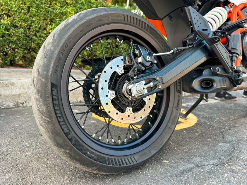 Para ser supermoto es bastante pesada. De hecho la comparamos con su hermana mayor la 690 SMC R y la diferencia de peso con líquidos llenos es de 1 kg.