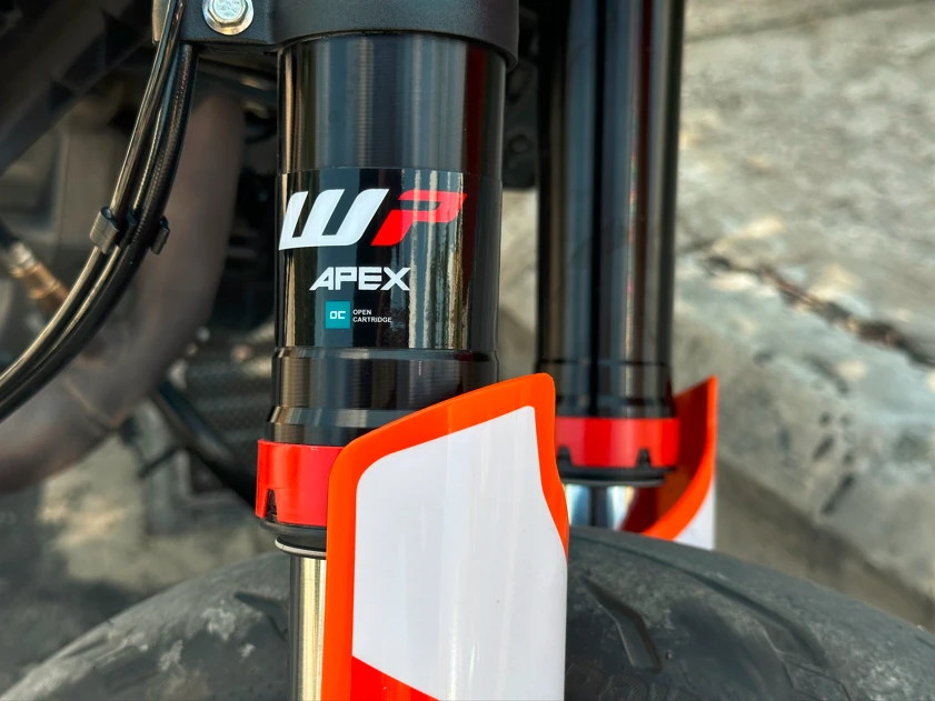Delante, una horquilla WP APEX de cartucho abierto de 43 mm y 230 mm de recorrido mantiene las cosas bajo control, con compresión y rebote ajustables en 30 sencillos clics para facilitar el ajuste. En la parte trasera, un amortiguador WP APEX de pistón separado con 230 mm de recorrido se encarga de los golpes fuertes. El amortiguador también es ajustable en rebote con 20 clics sobre la marcha, mientras que el ajuste de precarga puede realizarse con una herramienta.