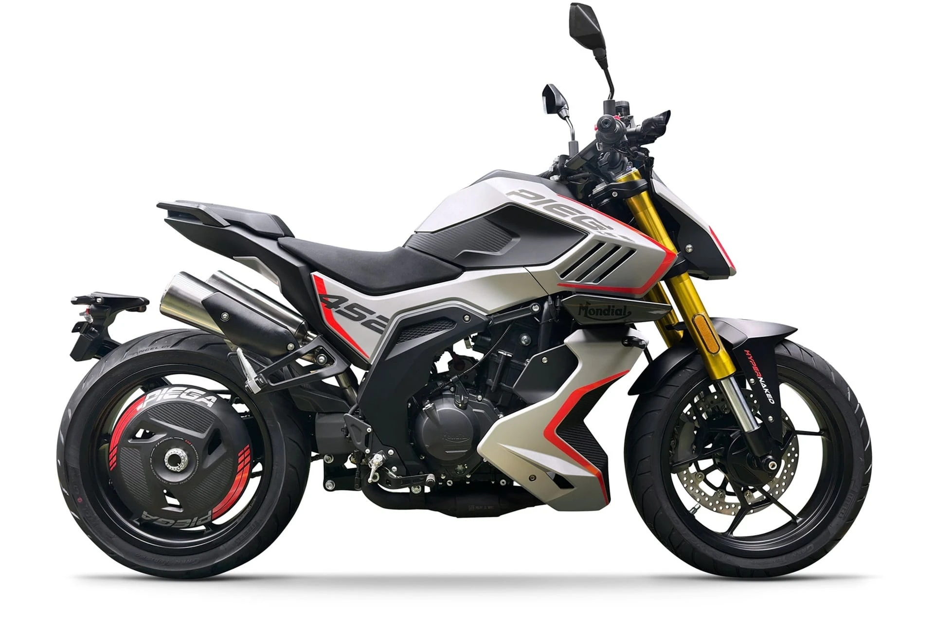 La Piega 452 es una naked deportiva. Está impulsada por un motor bicilíndrico en paralelo de 449,5 cc (DOHC, 8 válvulas). Declara unos 47,6 hp a 9.500 rpm y un par máximo de 39 Nm a 7.600 rpm en su versión internacional.