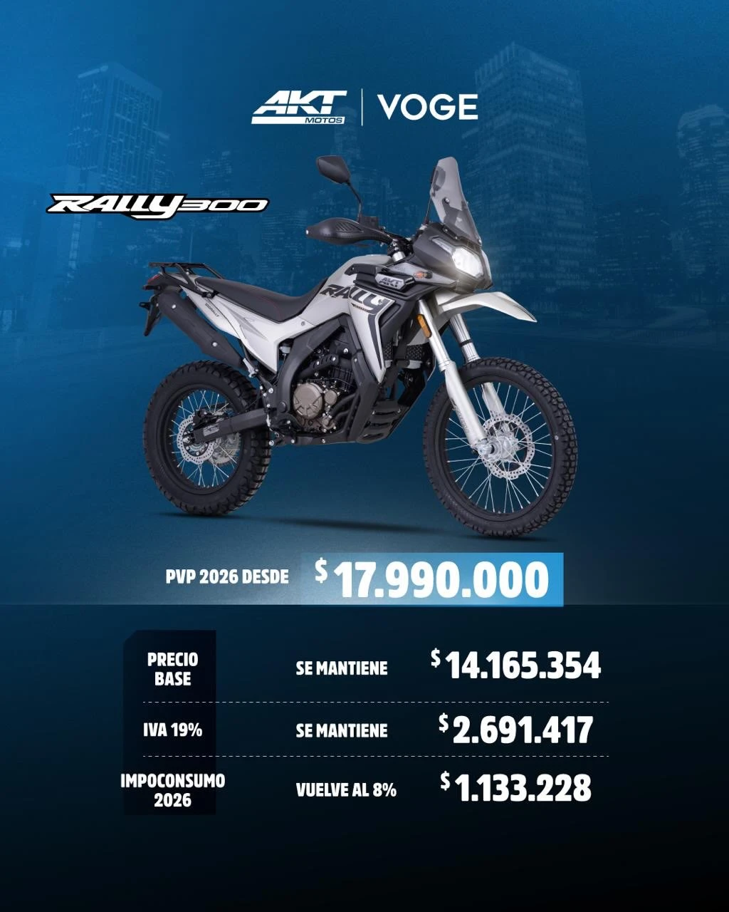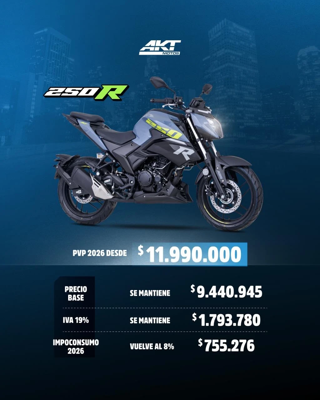 El impuesto al consumo (impoconsumo) del 19% para las motos de más de 200 cc dejaba con precios bastante altos a motos que no se podían considerar de lujo, recodemos que son motos de media cilindrada.