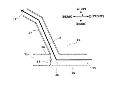 Si la solución para la aceleración es ingeniosa, la propuesta para el paso por curva es fascinante. La segunda patente describe un sistema capaz de redirigir los gases hacia abajo o lateralmente cuando la moto está inclinada.