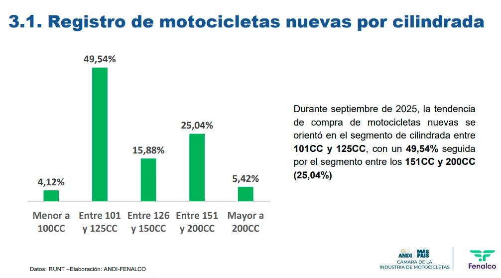 El informe de ANDI-FENALCO revela que las motocicletas entre 101 cc y 125 cc fueron las más demandadas en septiembre, con una participación del 49,5 % del total de registros. Estas motos son altamente valoradas por su bajo consumo, mantenimiento económico y versatilidad para el trabajo y la movilidad urbana.