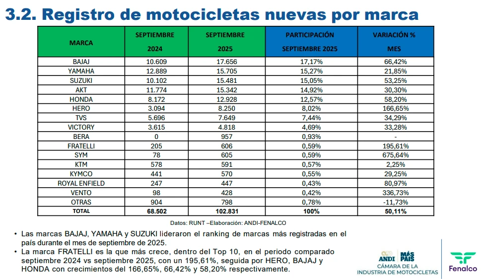 Además, nuevas marcas como Fratelli, SYM y Vento registraron crecimientos superiores al 100 %, reflejando la diversificación del mercado y el interés de los consumidores en alternativas diferentes.