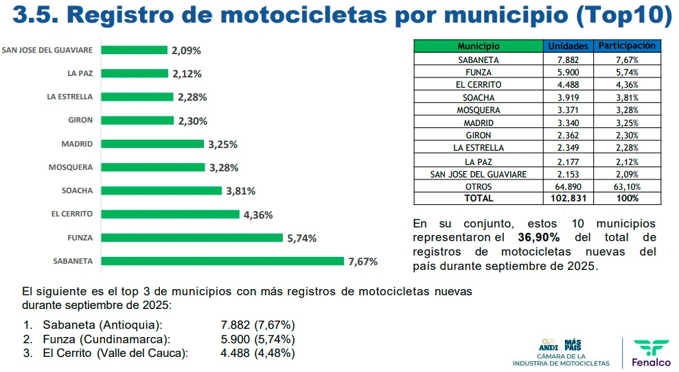 El liderazgo lo tuvo Sabaneta (Antioquia), con 7.882 motos nuevas, seguido de Funza (Cundinamarca) con 5.900 y El Cerrito (Valle del Cauca) con 4.488 registros.