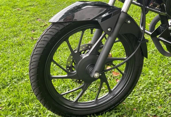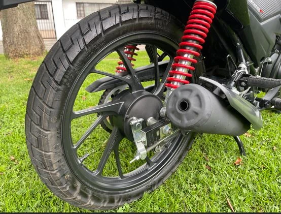 Uno de los puntos fuertes son sus rines de aleación de 18 pulgadas, cuyo diseño de 12 aspas no solo aporta estética, sino que mejora el comportamiento ante baches y resaltos urbanos. El sistema de frenado está compuesto por un disco delantero lobulado de 240 mm con pinza de doble pistón, mientras que en la rueda trasera se mantiene un sistema de tambor de 130 mm, ofreciendo una frenada progresiva y confiable.