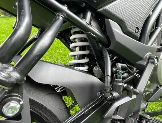 Atrás viene con un monoshock de poco recorrido, es lo que esperábamos, trabaja sabroso, no tenemos queja allí. Fue curioso cuando subimos un acompañante, atrás cayó demasiado la suspensión, se sintió raro, los pesos no eran elevados, quedamos con el sin sabor de la caída de esta.