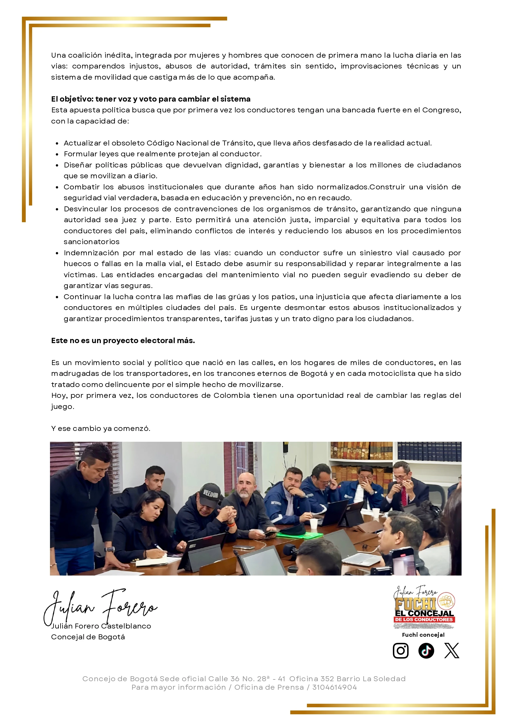 “Este no es un proyecto electoral más. Nació en las calles, en las madrugadas de los transportadores, en los trancones eternos, en cada motociclista tratado como delincuente por movilizarse.”
